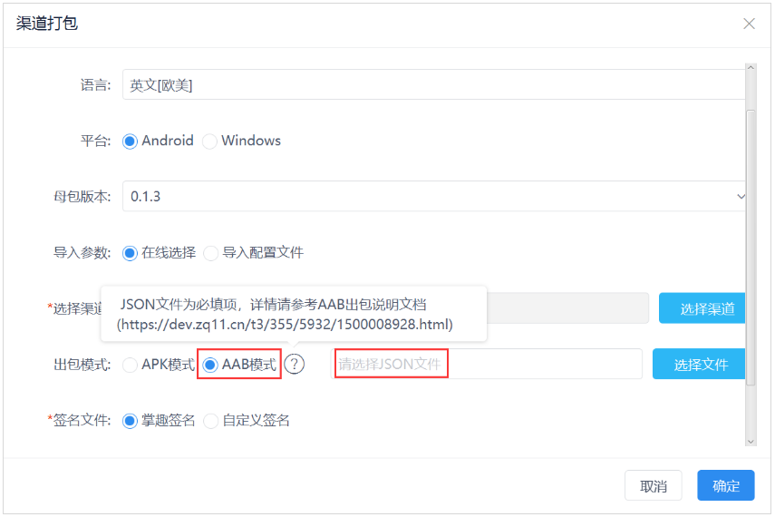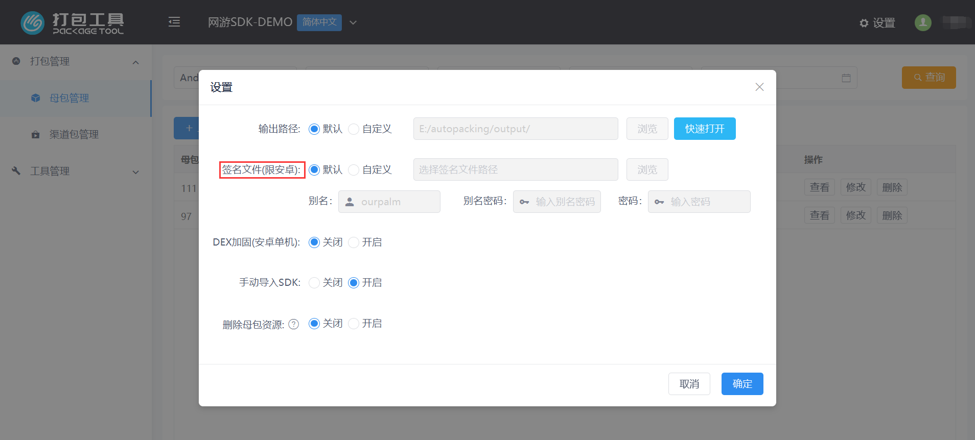 b. 签名文件:仅限安卓,默认掌趣签名,支持设置自定义签名。