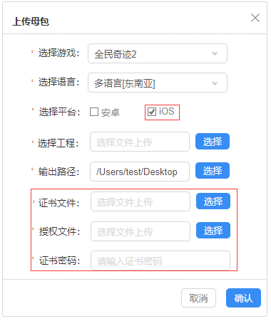 选择平台(iOS需要上传证书授权文件);选择母包版本(默认为最新上传且检测通过);