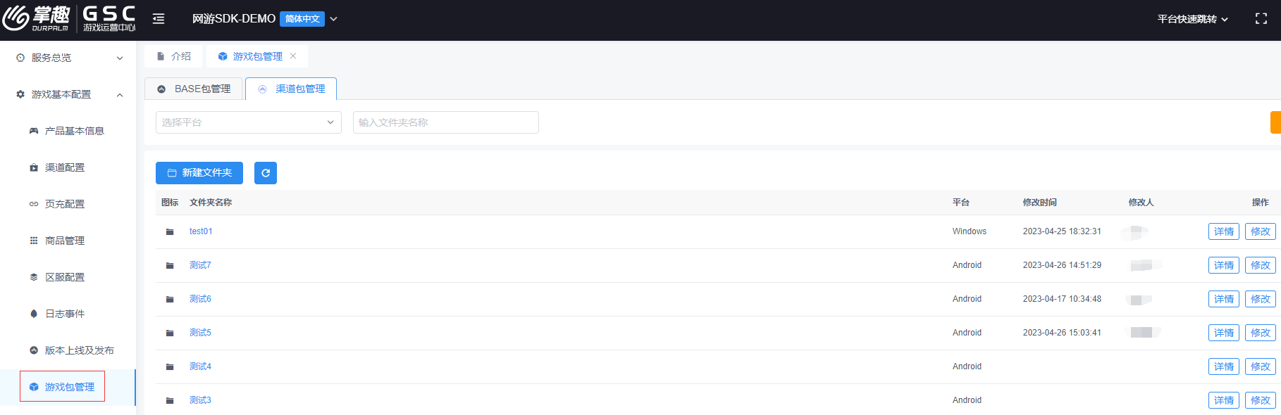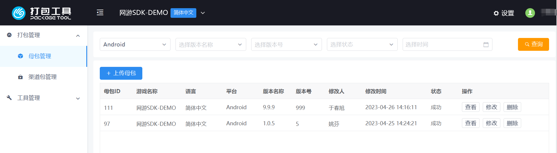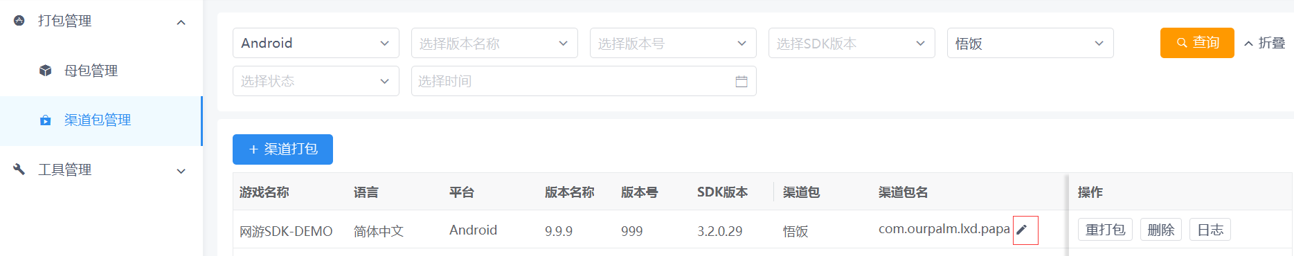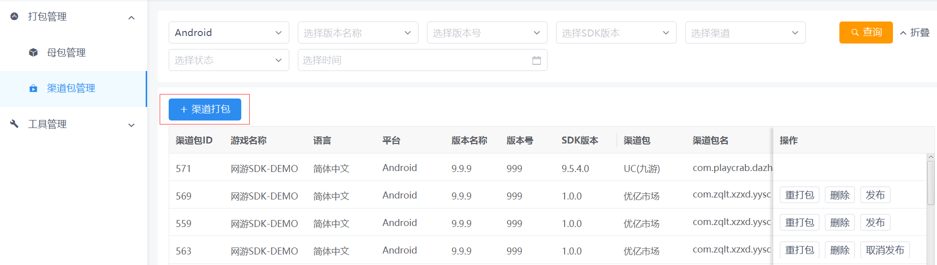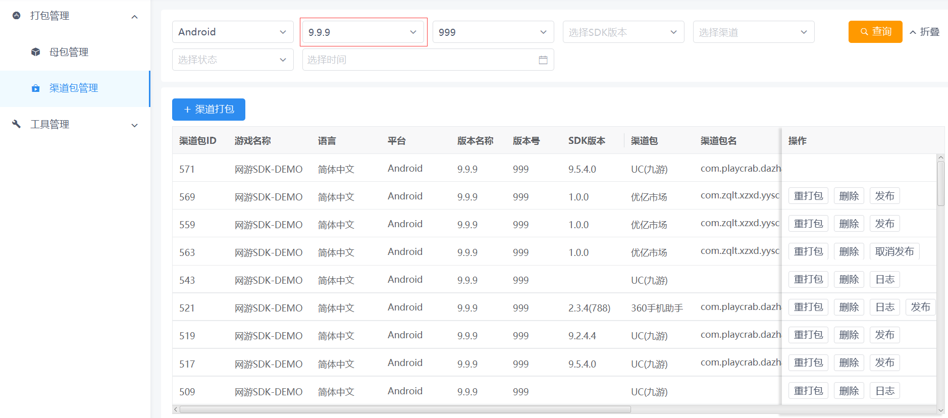 点击后跳转到“渠道包管理”页面,并筛选出对应版本的全部渠道包。