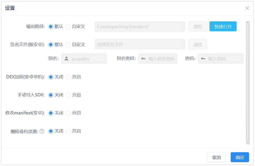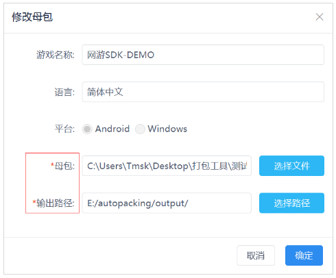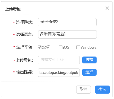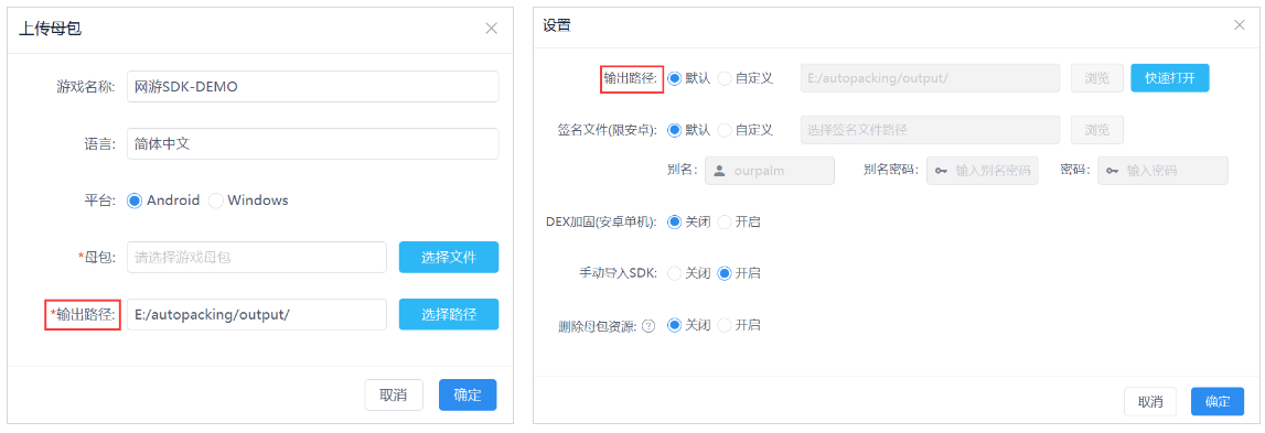 a. 输出路径:默认在E:/autopacking/output/,支持自定义设置,设置一次后,后续出包都会放在此路径下。