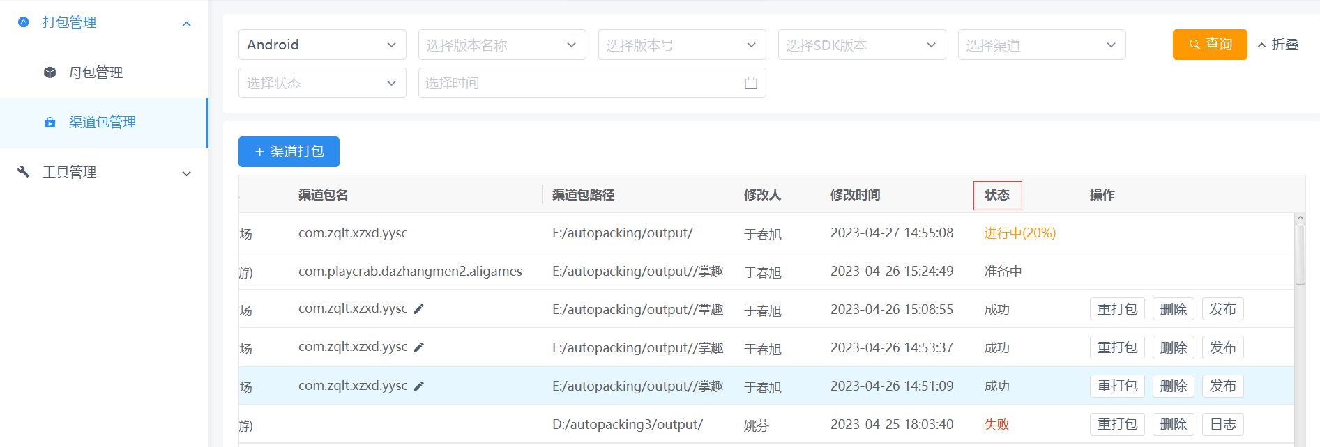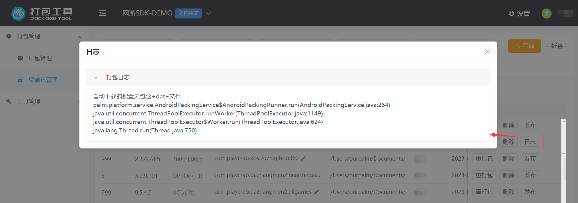 打包失败:点击“日志”查看打包失败原因,修改后视情况重新上传母包打渠道包。