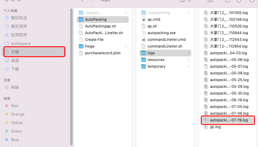 a. Mac系统log查看路径:Documents->AutoPacking->logs->对应日期的日志