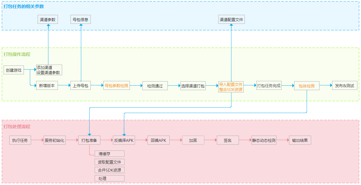 c. 打包操作流程:创建游戏->配置渠道参数->上传母包->母包参数检测->选择渠道打包->导入配置文件&整合SDK资源->包体检测->发布&测试;