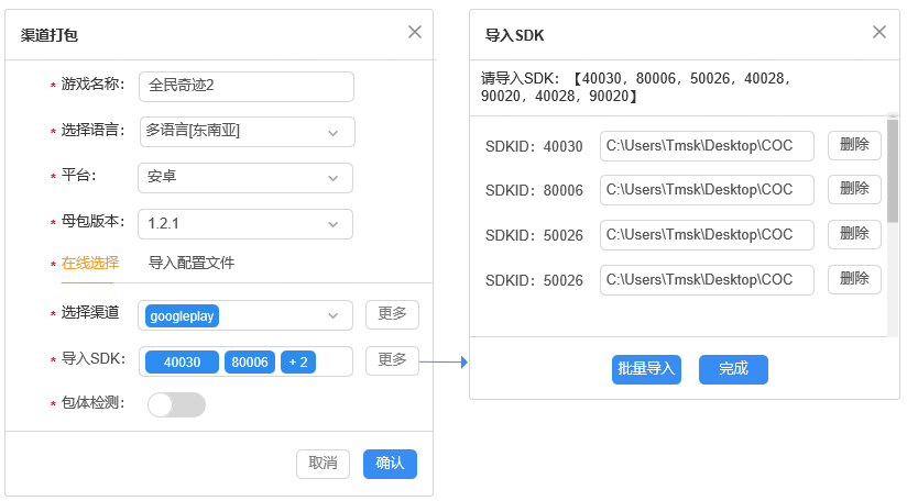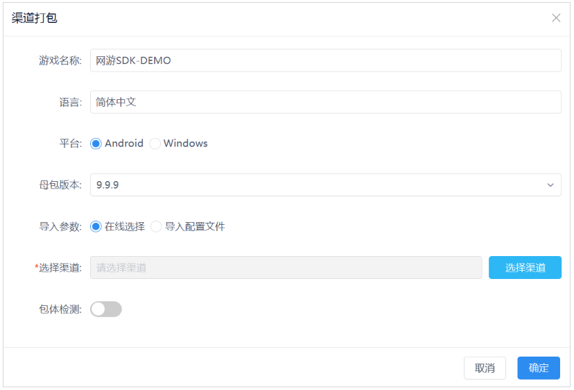 d. 手动导入SDK:默认关闭,在线下载SDK资源,打开后渠道打包时,需要手动导入SDK资源,便于平台内部测试。