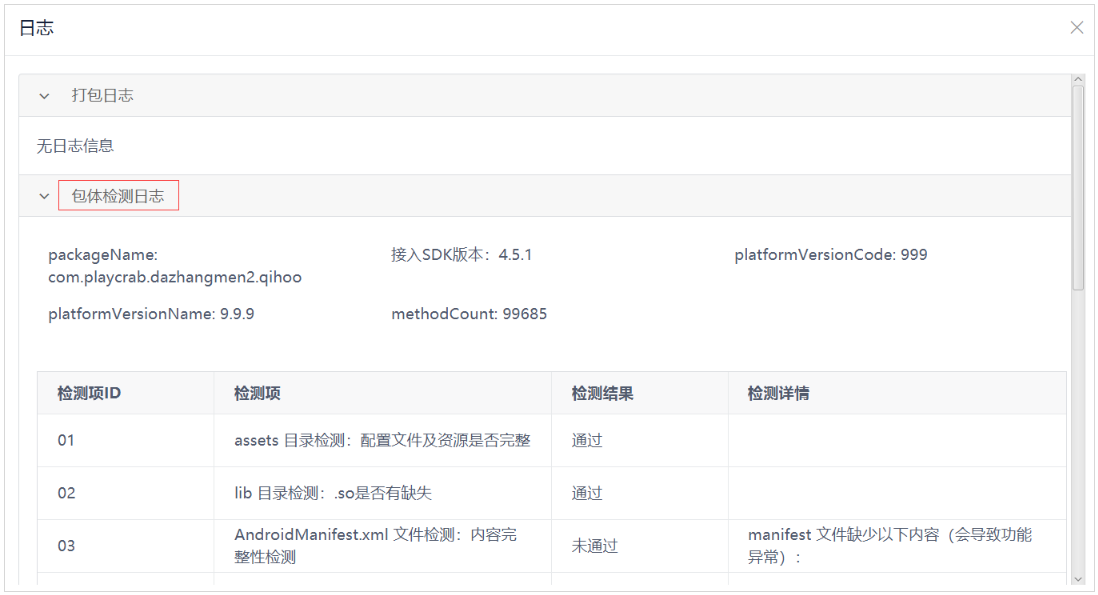 检测未通过,结果展示在“日志-包体检测日志”中;