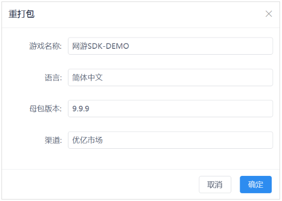 适用于平台渠道插件更新,游戏母包/渠道包无变更前提下,点击重打包即可,不需要重新走上传母包-渠道打包流程。