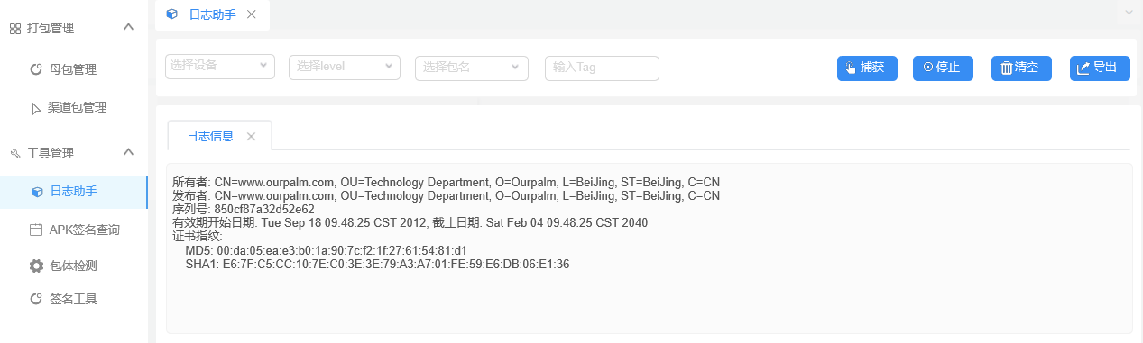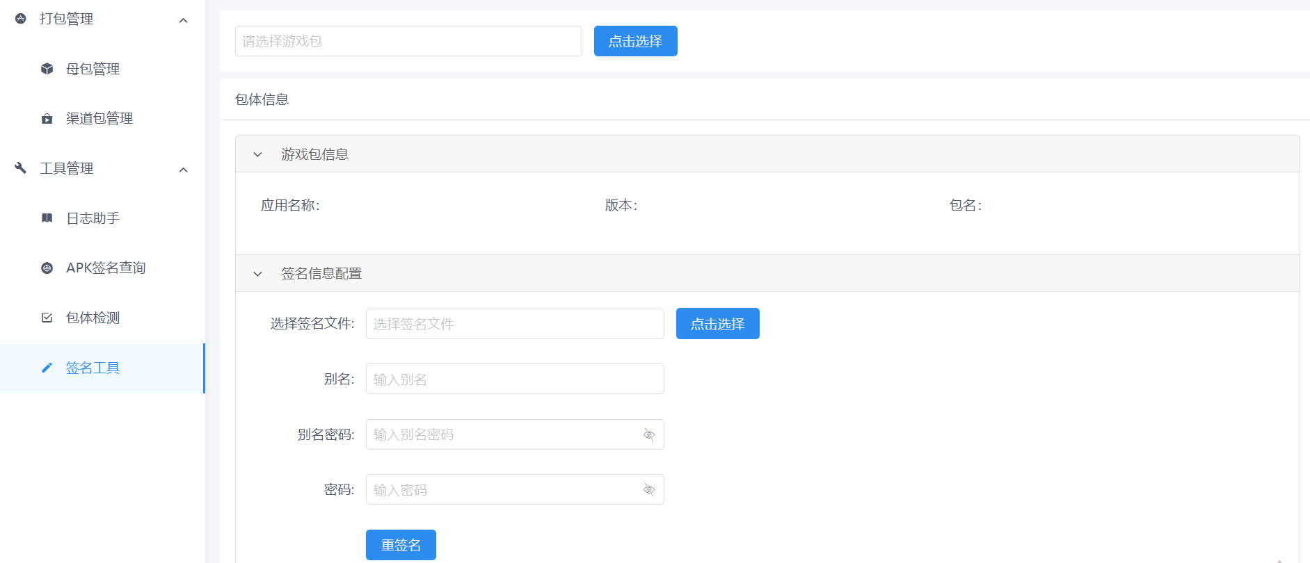 支持上传安卓apk游戏包,上传签名文件,设置别名和密码,对包体重新签名,便于研发测试。