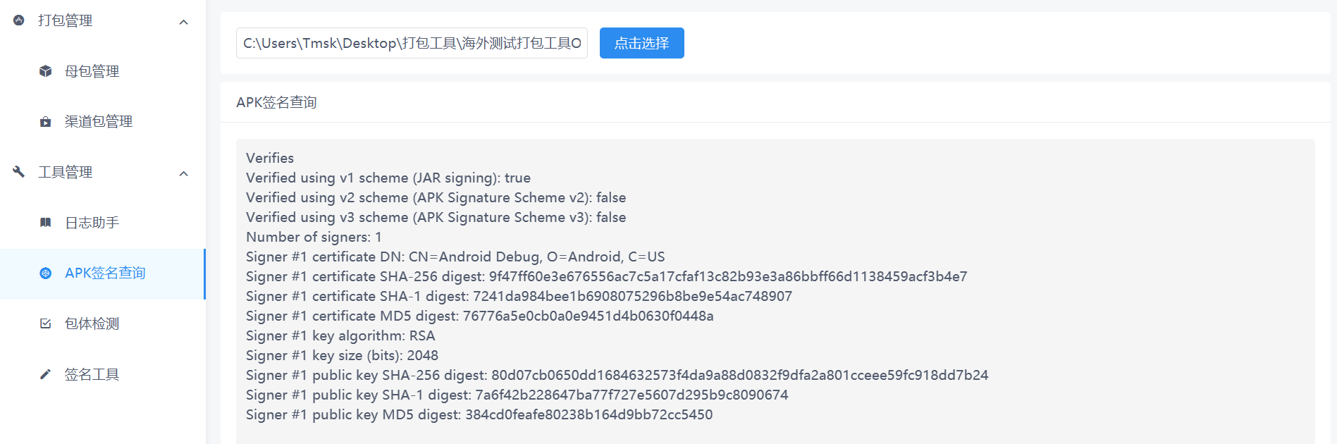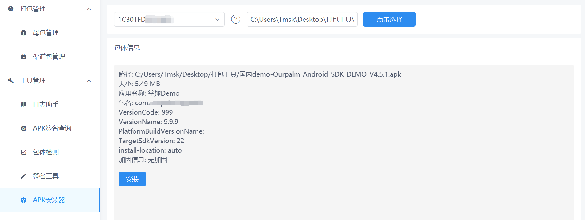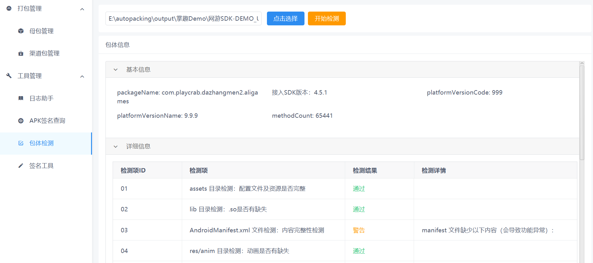 和“工具管理-包体检测”功能一致,只是此处渠道打包+检测可一步完成。