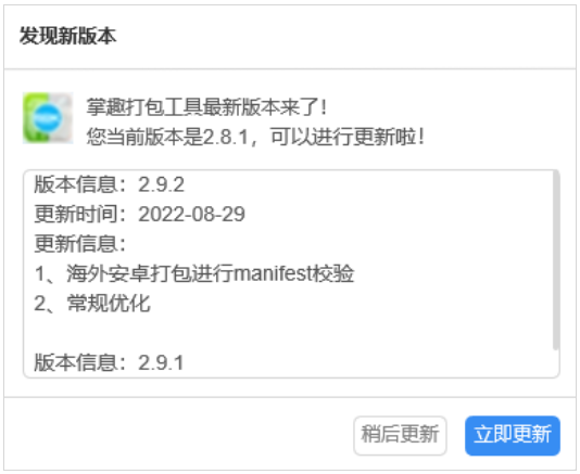 支持强更和非强更,非强更点击“稍后更新”,24h后会再次提醒。