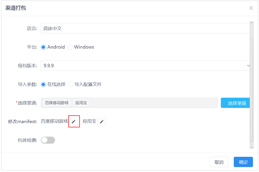 右上角设置里“修改manifest”开关打开后(默认关闭),渠道打包时支持修改所选渠道的manifest文件内容,一般用于特殊渠道。