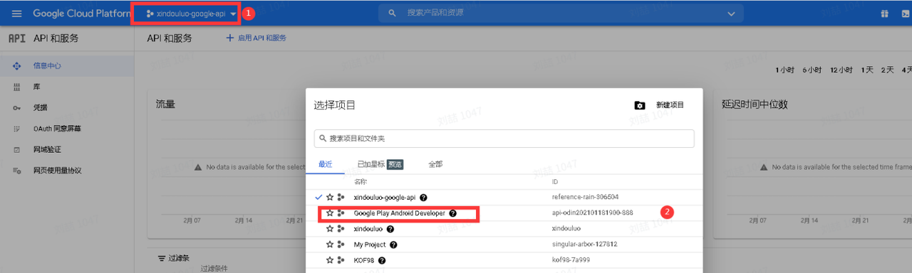 b. Google Cloud Platform后台OAuth客⼾端创建:选择下图标1的地⽅,选择标2的地⽅的项⽬(默认项⽬);