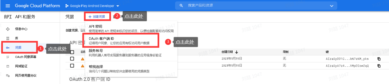c. 按照下图的顺序点击,创建OAuth客⼾端ID;
