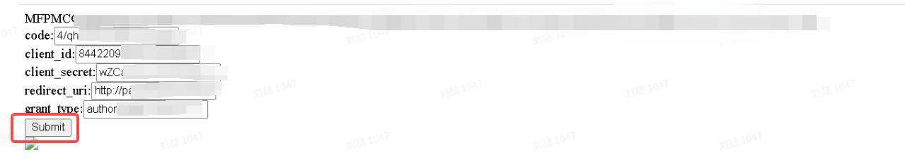 e. 使用平台技术提供的工具,将上述参数复制进去,点击Submit即可获得refresh_token(切记只能获取一次)