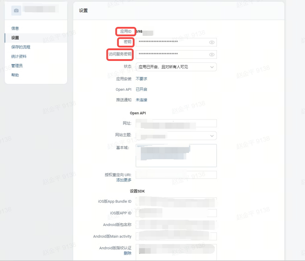 设置-基本里可查看,应用编号对应FB_App_ID,应用密钥对应FB_Client_Token,显示名称对应FB_App_Name。